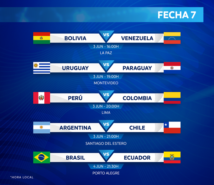 La Confederación Sudamericana de Futbol (Conmebol) informó este jueves los horarios para celebrar las fechas 7 y 8 de la Eliminatoria Sudamericana rumbo a Qatar 2022, que se celebrará a finales del próximo año. La doble jornada se realizará entre el 3 y el 8 de junio próximos, luego que las fechas 5 y 6 fueron canceladas, debido a la negativa de varios clubes europeos de ceder a sus jugadores por la pandemia.