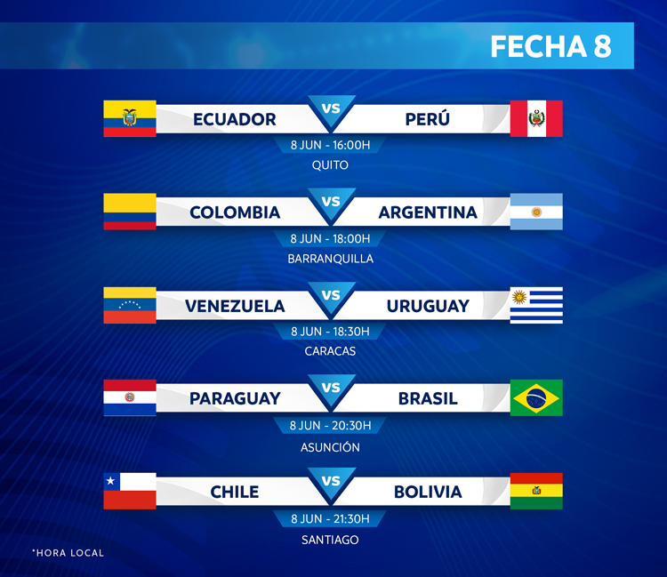 En la jornada 8 destaca la visita de Argentina a Colombia y la de Paraguay en Brasil. Este es el calendario de los otros ocho partidos programados: